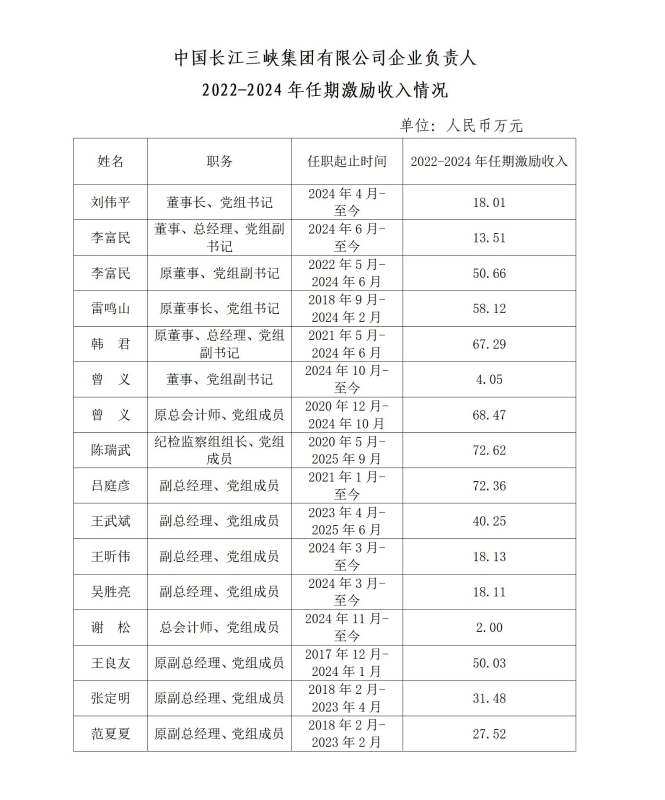 中國長江三峽集團(tuán)有限公司企業(yè)負(fù)責(zé)人2022-2024年任期激勵(lì)收入情況